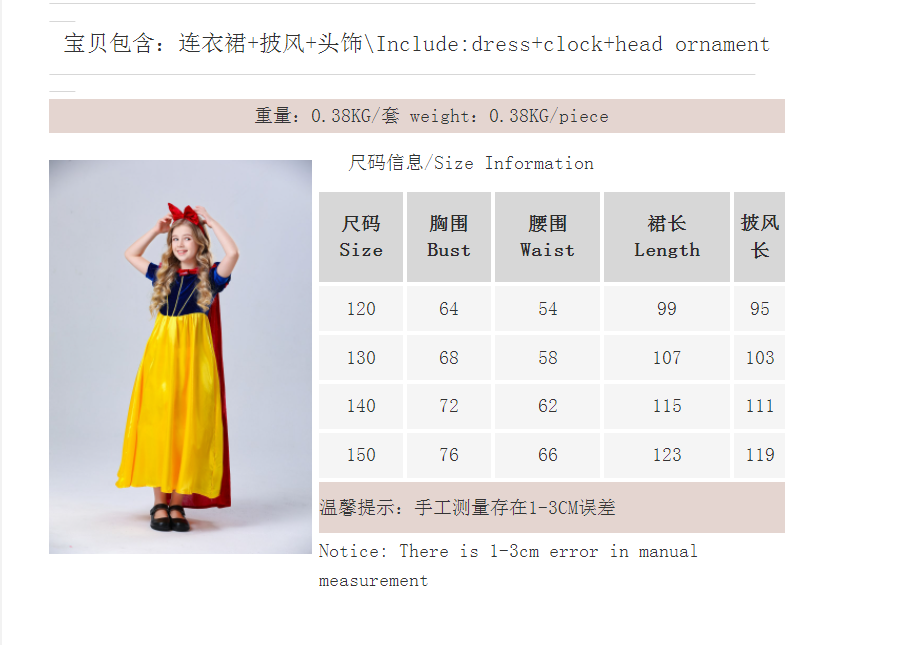 - Product Name: Halloween Fairy tale Children Snow White Dress Stage Show Cosplay Costume YM8746