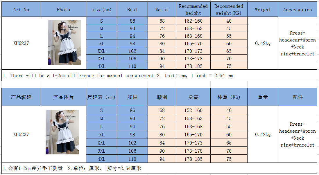 - Product Name: Women Maid Dresses Costume Classique Lolita XH6237